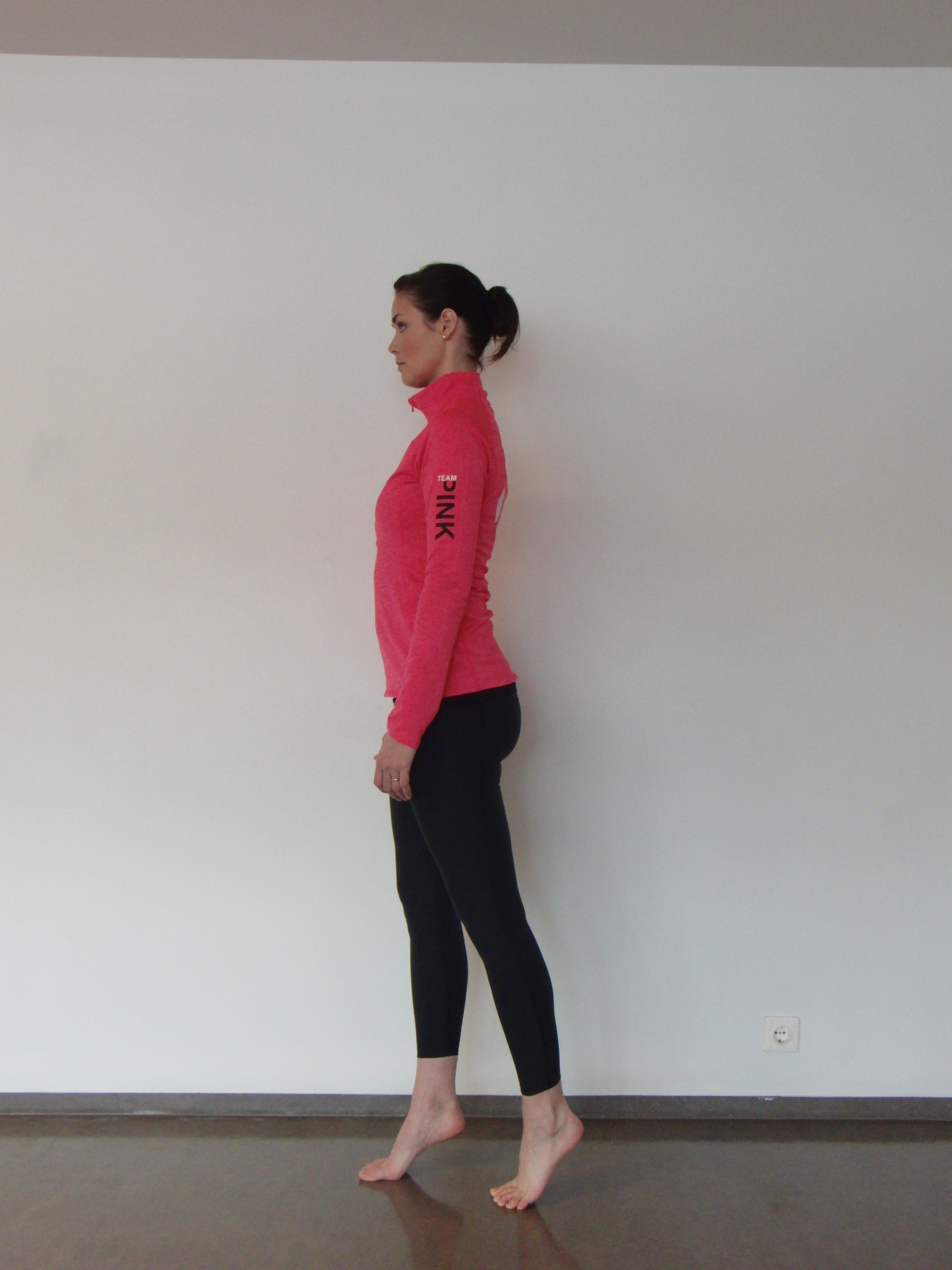 - Lyfta á báðum fótum upp á táberg, færa þungann á tábergið, lyfta hælum vel upp frá gólfi og síga síðan rólega niður