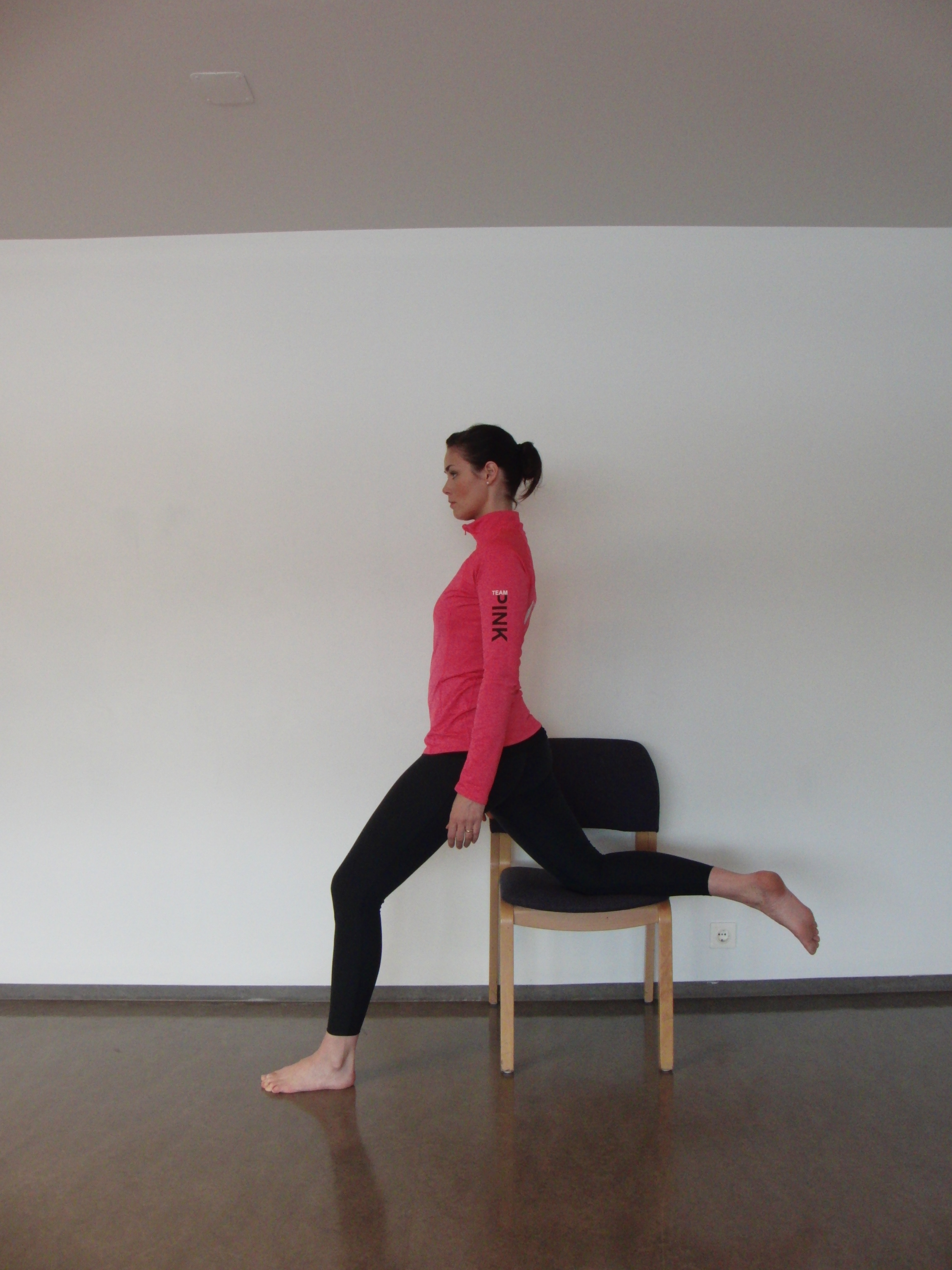 - Standa með hægri fót fyrir framan þann vinstri, vinstra hné á stól og vel fyrir aftan mjaðmir.